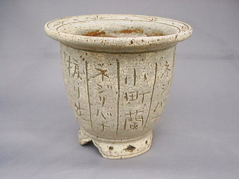 ![]() エビネ鉢 『唐草模様 象嵌』 エビネ蘭の全盛期三橋氏が唐草模様を白地の象嵌仕上げしている。 貴重品(桐の箱付き) 作者(三橋俊治 氏) |