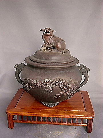 香炉 『焼締め 浮彫り、龍、蓋獅子 像の鼻 雲足』