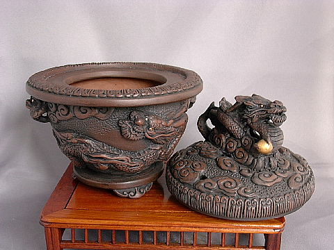 5.香炉 『焼締め 浮彫り、龍、蓋龍 雲足』