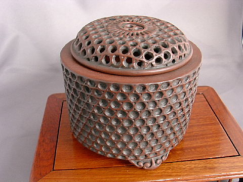 6.香炉 『焼締め 網目模様 蓋網目透かし 雲足