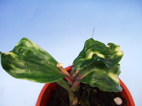 ![]() 11.黒蘭(コクラン)『萌黄掃込み中斑』 黒蘭(コクラン)『萌黄掃込み中斑』 地味柄ですが、芽変わりで素晴らしい斑が出ています |